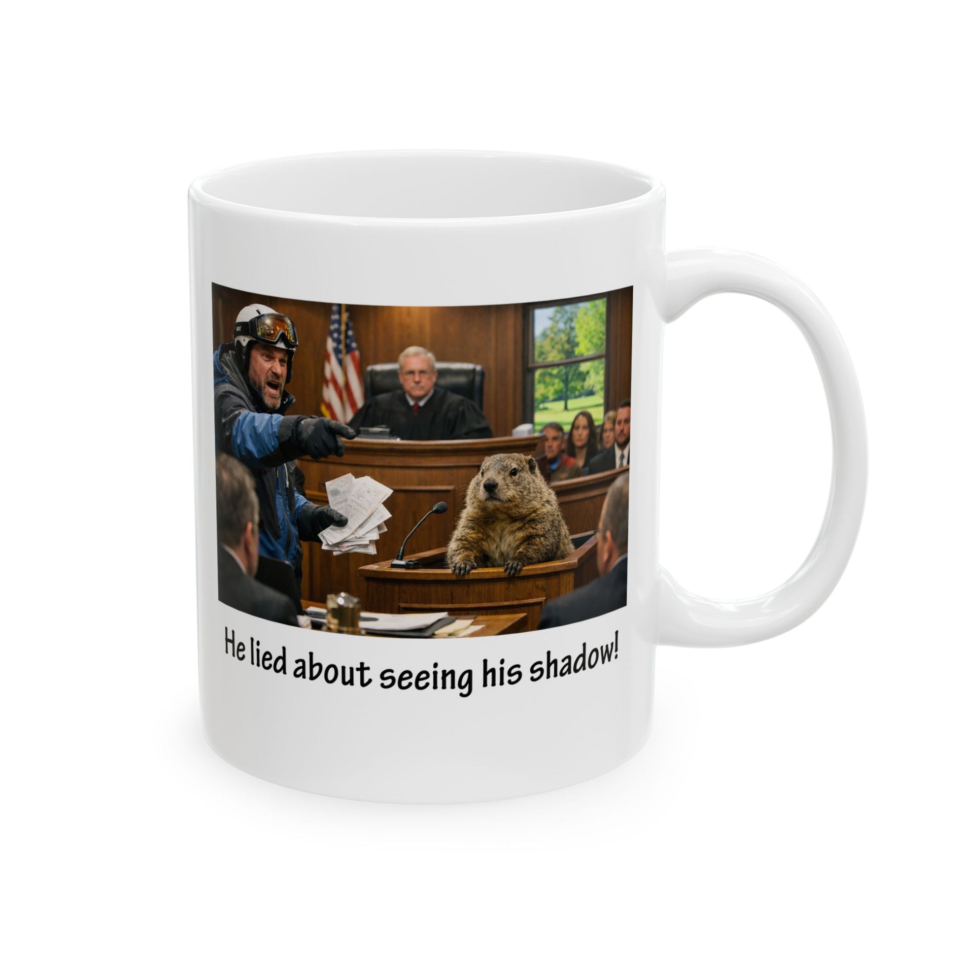 Introducing the "He Lied About Seeing His Shadow" Coffee Mug – the perfect holiday gift for anyone with a great sense of humor! This mug features a side-splitting courtroom scene where a man angrily accuses Mr. Punxsutawney Phil of lying about seeing his shadow. Thanks to this fib, our hapless skier splurged on ski equipment and lost a non-refundable deposit at a ski resort, only for spring to arrive early.