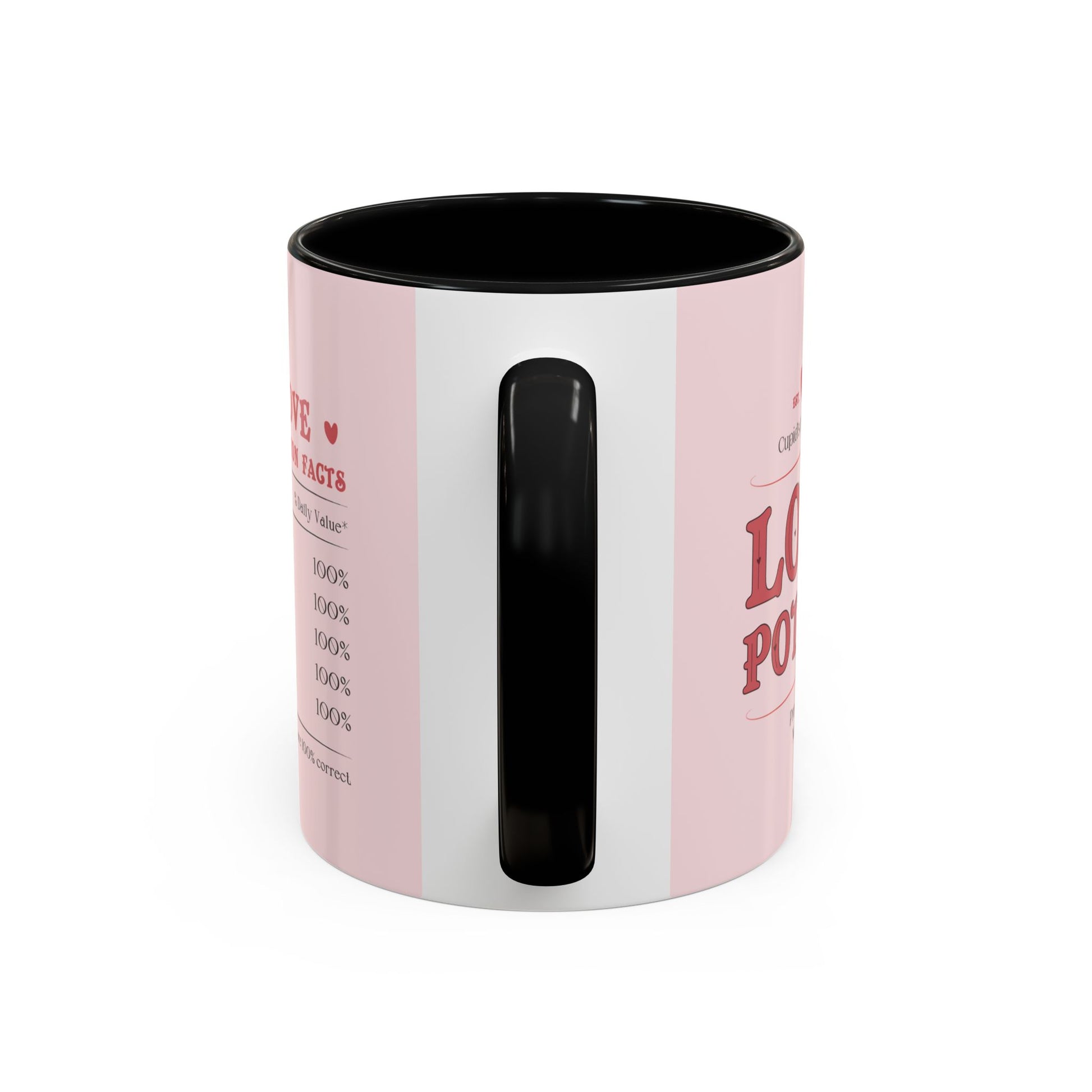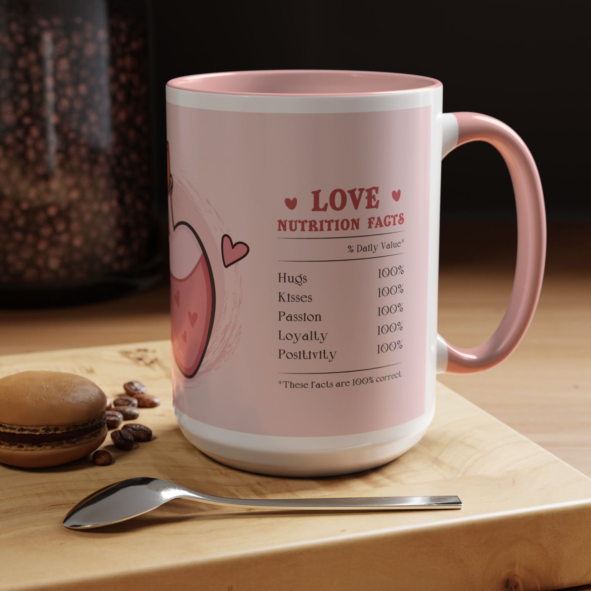 This glossy ceramic accent mug brings a warm, playful vibe to slow mornings and late-night chats. Soft pink wraps the surface while a heart-shaped potion bottle and tiny hearts hint at tender, whimsical magic. One side lists cheeky "Love Nutrition Facts"—a lighthearted take on devotion that sparks smiles between sips. The colored interior and handle add a bold contrast that makes the artwork pop and the mug feel personal, like a small ceremony for someone who loves sweet, quirky details.
